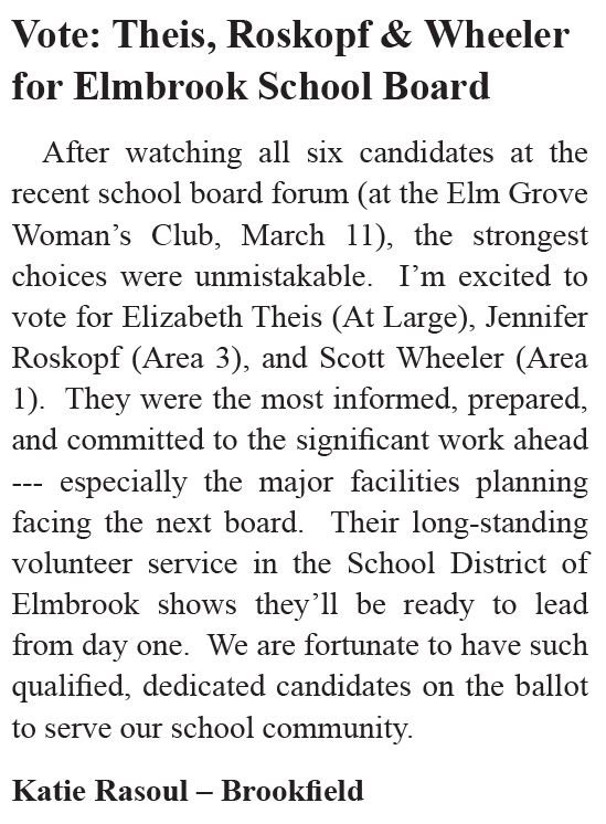 “As former superintendent and continuing Elmbrook School District resident, it’s my privilege to enthusiastically support Burleigh parent Elizabeth Theis in the upcoming April 7 School Board election. Elizabeth has the professional qualifications to discern needed school board decisions coupled with her already demonstrated personal skills in leading school district initiatives as a volunteer.”